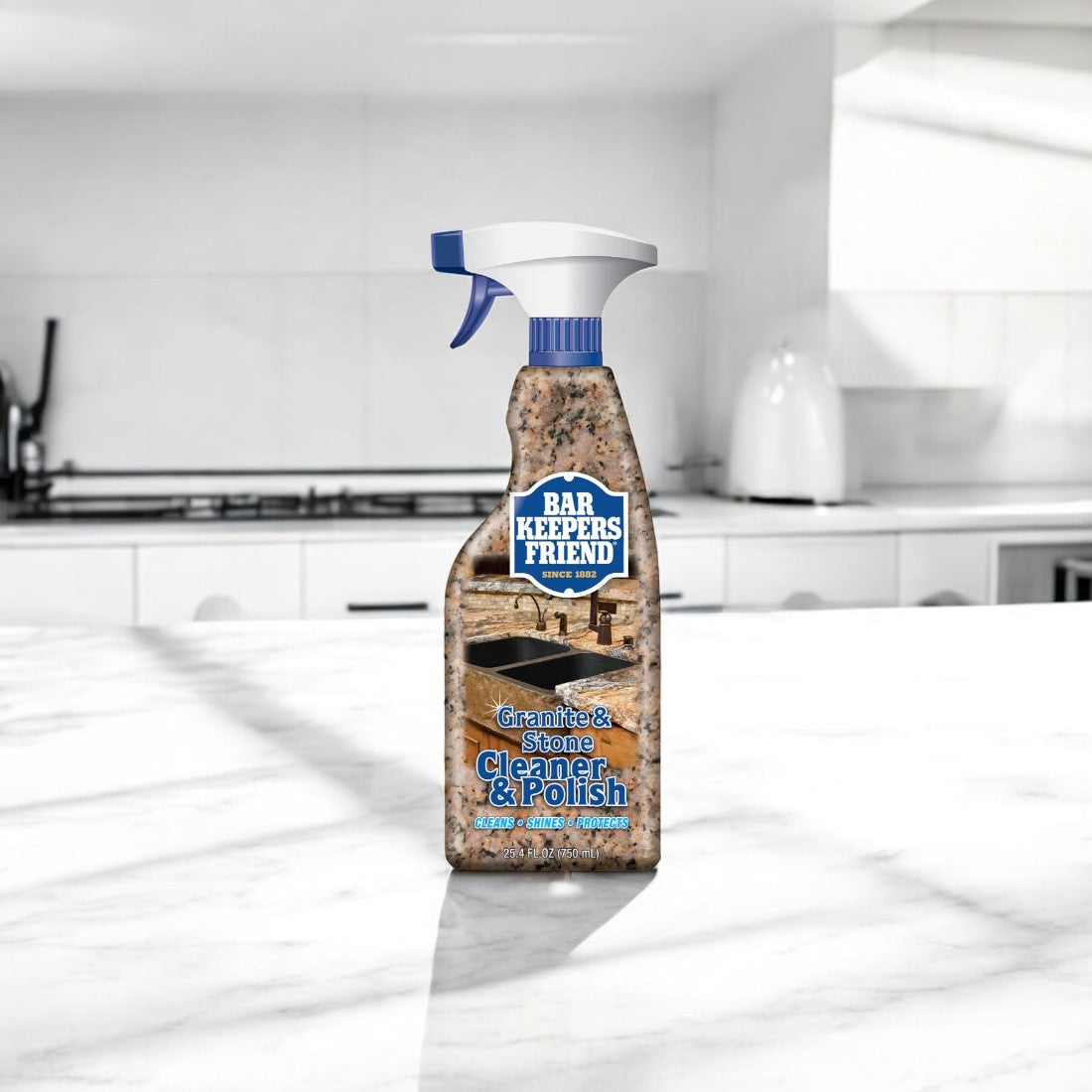 Bar Keepers Friend Granite & Stone Cleaner & Polish is a safe alternative to harsh spray cleaners, bleach, and abrasive cleansers. Keep your countertops looking brand-new with BKFâs new product for granite and stone surfaces.