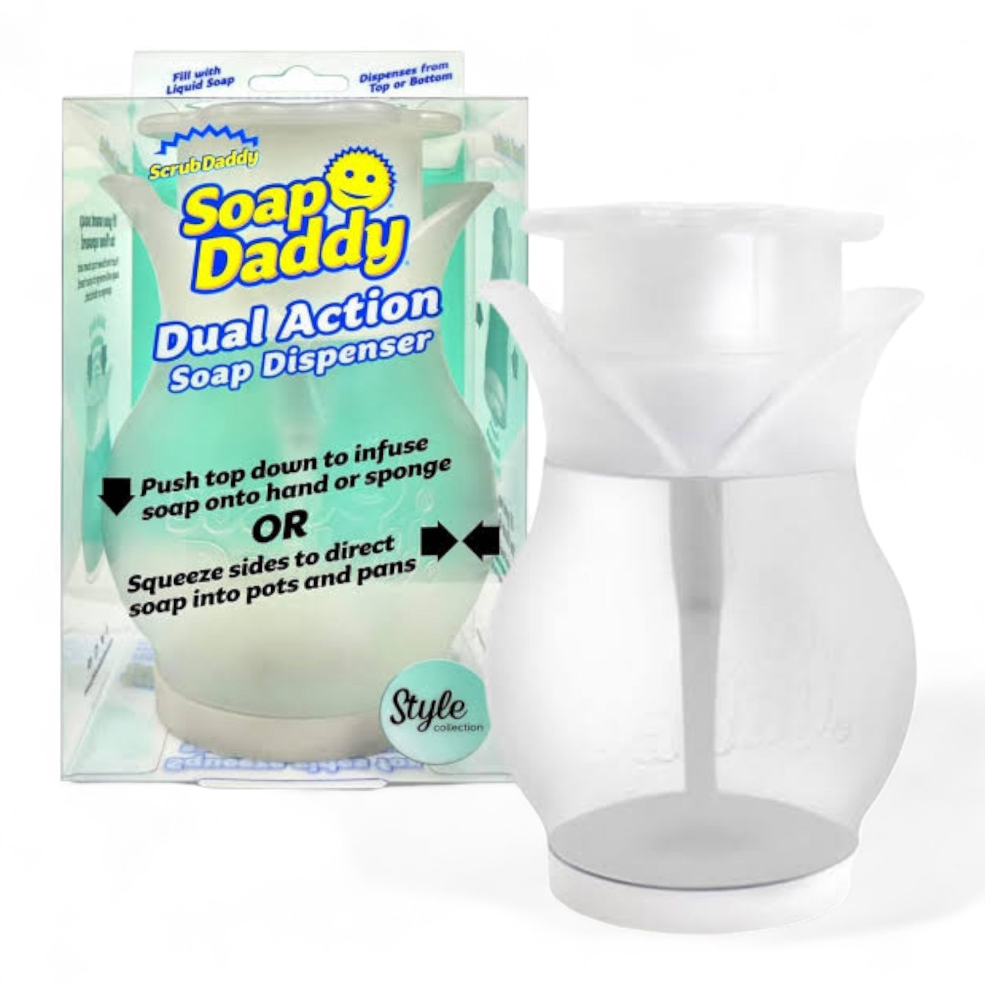 The Soap Daddy is a dual-action soap dispenser designed to bring convenience and style to your kitchen or bathroom. Fill it with your favourite detergent and enjoy two ways to suds!